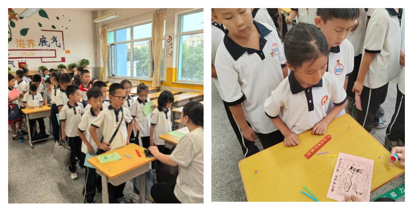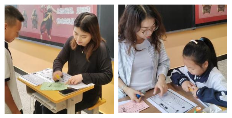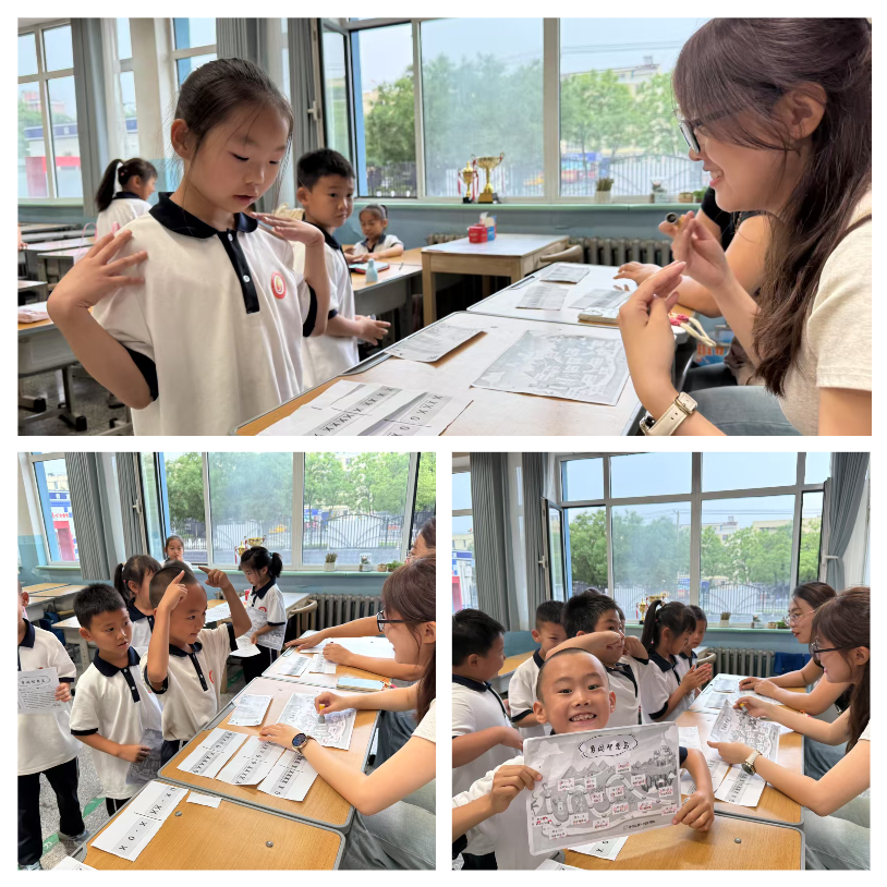 除了語文和數(shù)學,科學、美術(shù)、體育學科的闖關(guān)活動同樣精彩紛呈。科學闖關(guān)“操作小能手”考驗的是同學們對方向和位置的辨認能力?!鞍奖谀倪傅奈鞅狈较?,太乙真人在哪吒的東北方向...”同學們根據(jù)描述,小心翼翼地將人物卡片放到正確的位置,在實踐中加深了對方向的理解。