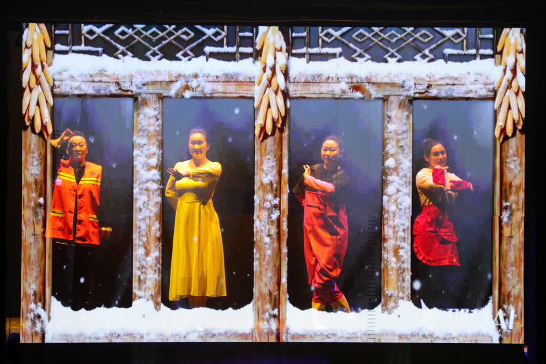 為增強(qiáng)觀眾參與感,晚會(huì)特設(shè)“非遺贈(zèng)?!被?dòng)環(huán)節(jié),通過(guò)抽簽方式向幸運(yùn)觀眾贈(zèng)送非遺傳承人現(xiàn)場(chǎng)制作的剪紙、刺繡、樹皮畫等手工藝品,讓傳統(tǒng)文化可觸可感。60秒限時(shí)拉票環(huán)節(jié)更將氛圍推向高潮,借助聲量分貝儀評(píng)選“村晚人氣之星”,臺(tái)下吶喊與掌聲交織,熱度持續(xù)攀升。晚會(huì)舞美設(shè)計(jì)亦匠心獨(dú)運(yùn),采用多層遞進(jìn)式屏幕矩陣,以“全息屏+冰屏+LED屏”的組合打造出富有縱深感的沉浸式視覺(jué)空間,為現(xiàn)場(chǎng)觀眾帶來(lái)全方位、立體化的視聽震撼。