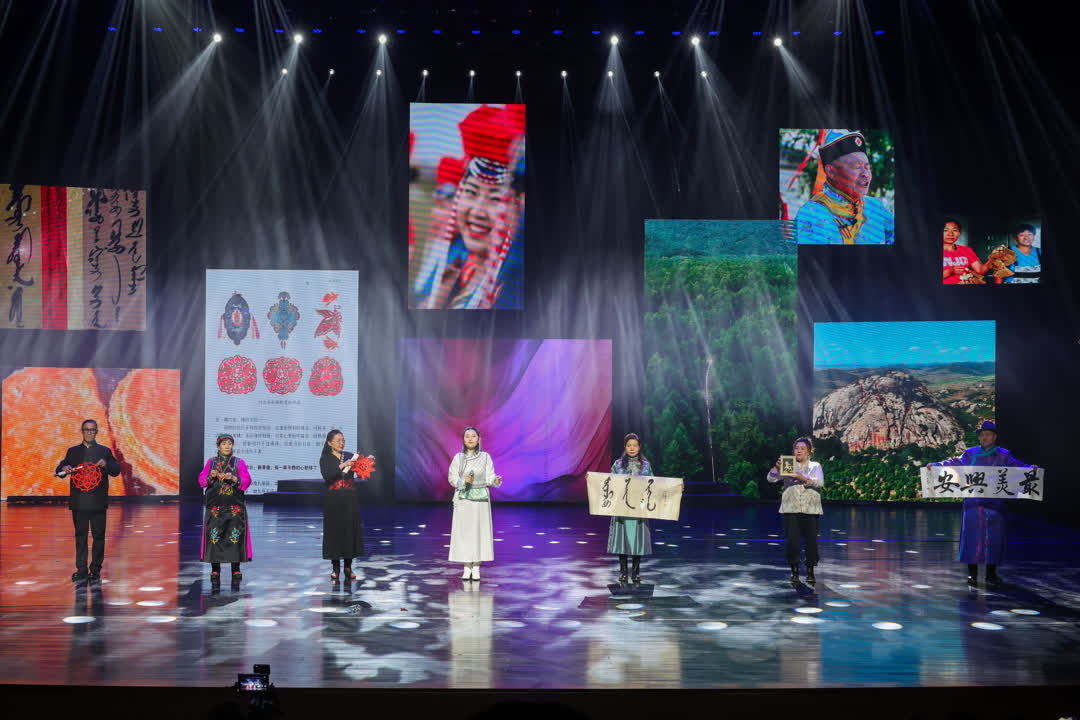 “過(guò)了一村又一店”板塊聚焦“文化村長(zhǎng)”帶來(lái)的草根絕活,武術(shù)《燕青拳》、二人轉(zhuǎn)聯(lián)唱、說(shuō)唱《向天歌》等特色節(jié)目輪番登場(chǎng),精彩不斷。“非遺花開幸福村”板塊集中呈現(xiàn)文化傳承魅力,近80人的四胡齊奏《激情草原》氣勢(shì)恢宏,烏力格爾《草原之子》以蒙漢雙語(yǔ)創(chuàng)新演繹紅色故事,圍繞蒙古族刺繡創(chuàng)作的小品《錦繡前程》與歌曲《時(shí)光的針腳》,生動(dòng)展現(xiàn)了7項(xiàng)國(guó)家級(jí)非遺項(xiàng)目、79項(xiàng)自治區(qū)級(jí)非遺項(xiàng)目、258項(xiàng)盟級(jí)非遺項(xiàng)目的豐富內(nèi)涵。
